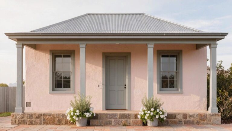 Soft pink stucco walls catch the eye in a gentle way. They bring warmth to the house without overpowering the yard. Here, the color works well against a gray metal roof and simple potted plants. It feels calm and fits right into a relaxed outdoor setting.