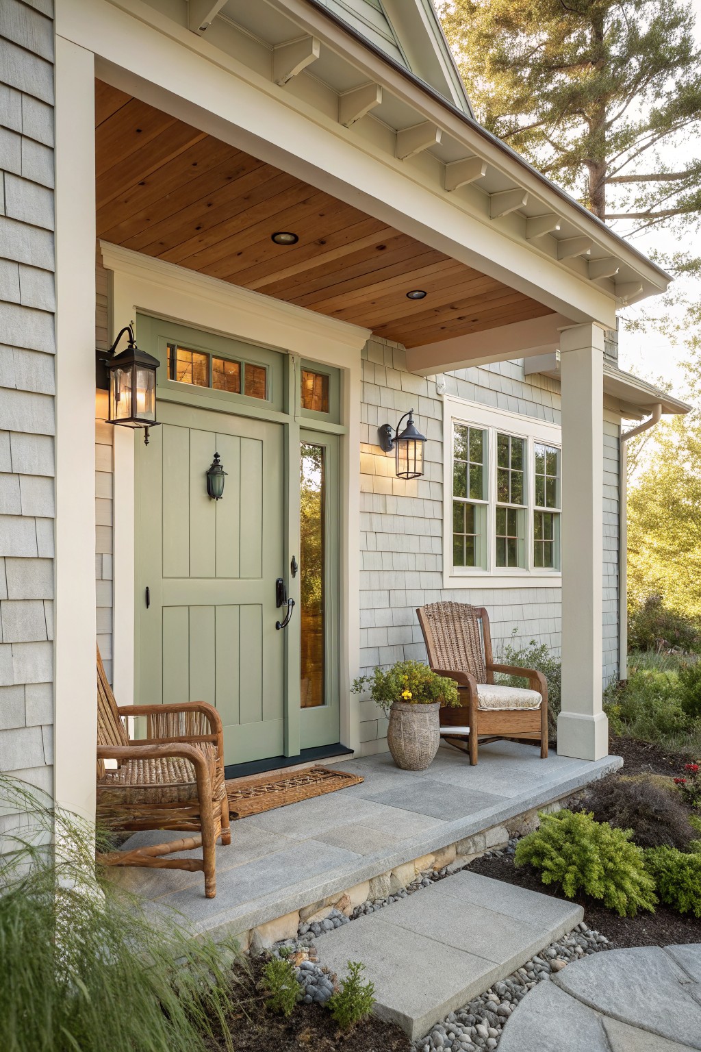 You can pull this off on most homes with a covered porch. Go for reclaimed wood or something similar in a natural finish, and add wall lanterns for evening glow. It suits craftsman or contemporary styles best… just make sure the door hardware is sturdy to match the bold look. Skip it if your porch is super narrow.